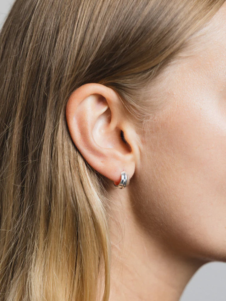The simple but elevated Bodie Hoop; a pair of ridged huggie hoop earrings. Made from 925 Sterling silver.