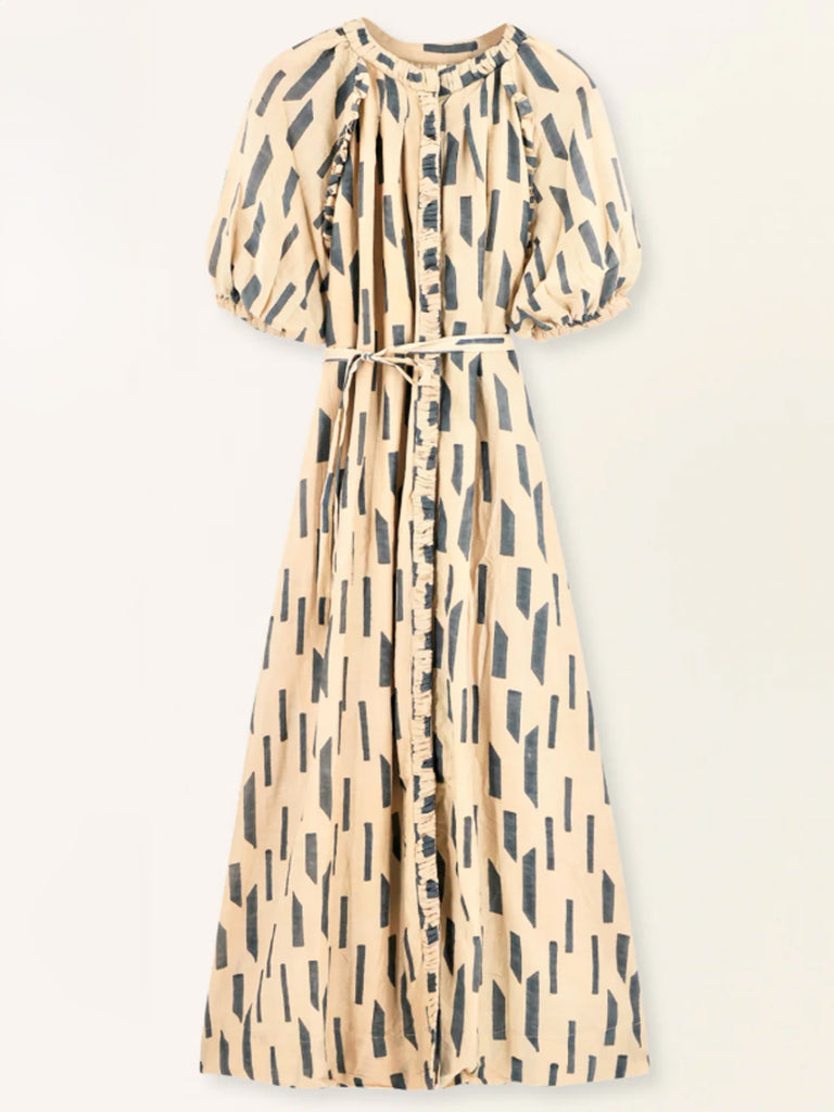 Hand screen-printed, 100% cotton voile, ankle length dress with raglan sleeves. Featuring a high low hem and optional tie belt.