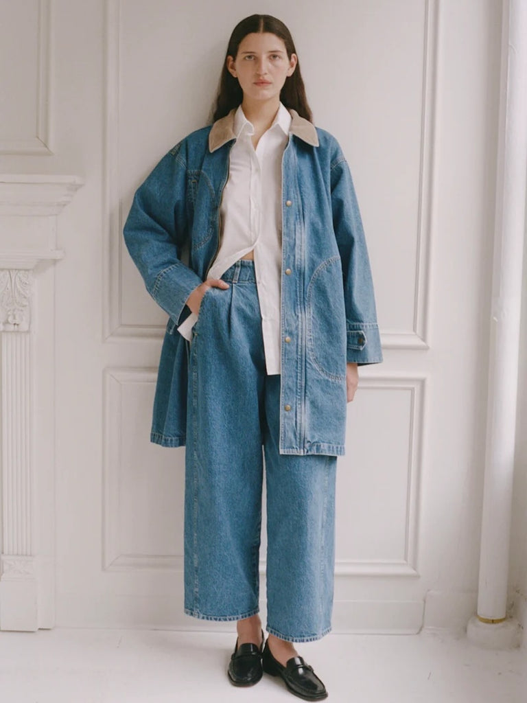 A long duster utility coat in Italian Denim with chest and waist pocket details at front, zipper and snap closure entry, contrast corduroy collar and longer length. This is a roomy fit coat, perfect for layering knits under. A hardworking piece for all season wear.