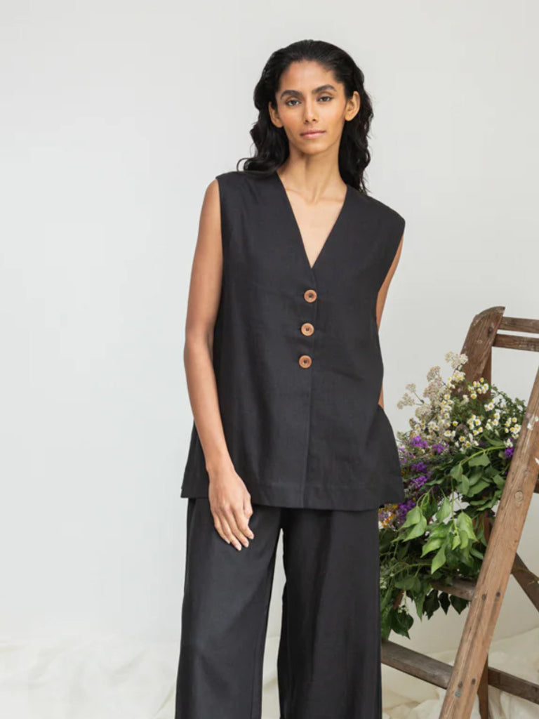 The Wren-May vest is a longline style, with split sides and buttons made from sustainable corozo.